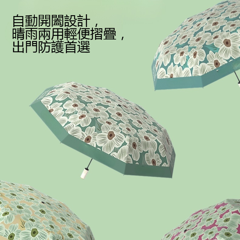 黑膠防曬自動折疊太陽傘,抗UV隔熱,輕巧便攜,自動開收設計,適合日常外出與旅遊,多色選擇,防風耐用。
